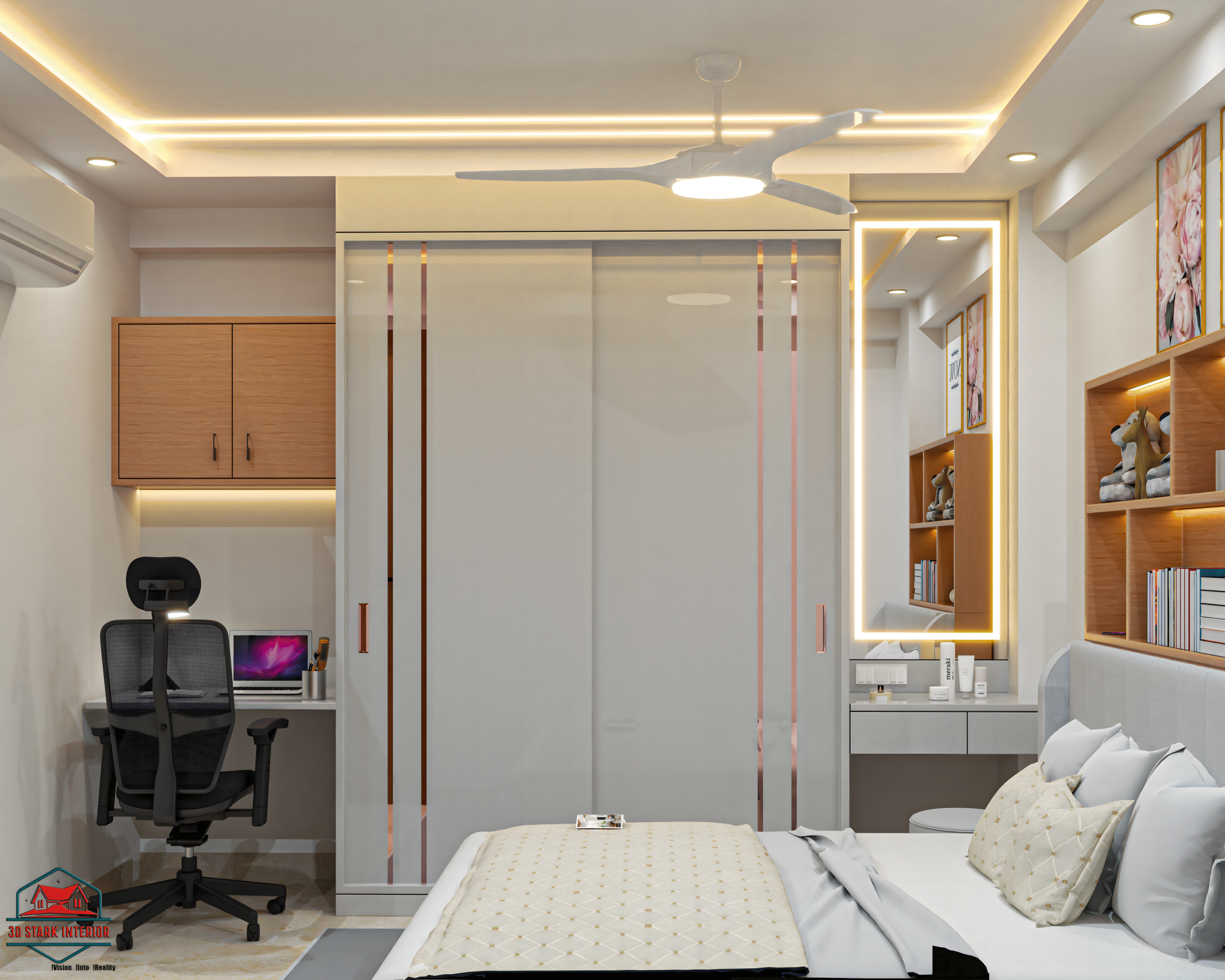 At 3D Stark Interior Design, we understand that a daughter’s room is more than just a space—it’s her personal haven where she dreams, learns, and grows. Our design approach for this project reflects a perfect blend of creativity, warmth, and functionality. Soft, soothing color palettes are paired with vibrant accents to create an atmosphere that is both calming and cheerful.